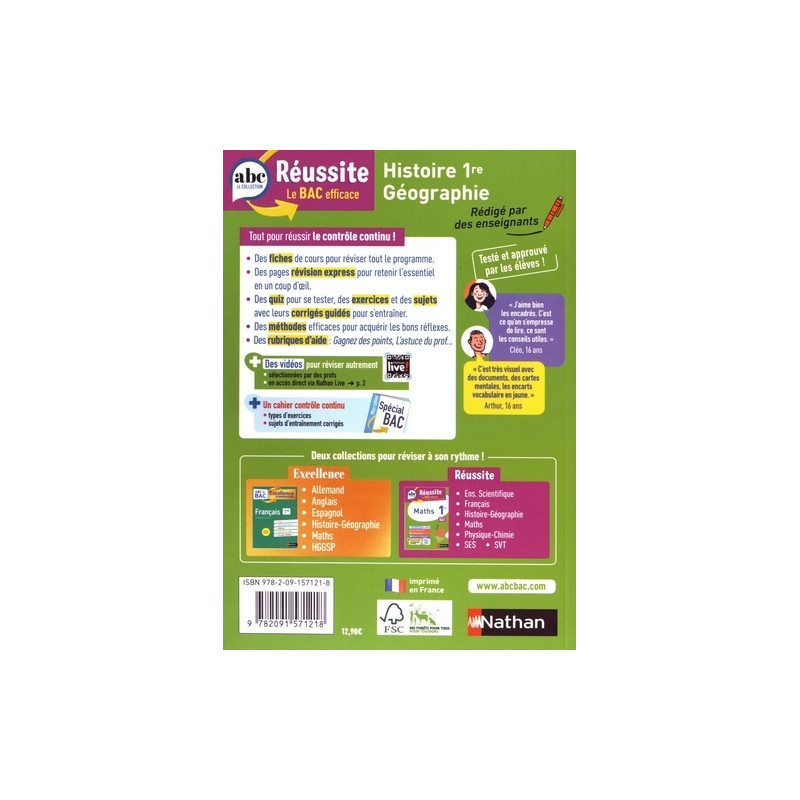 Des fiches de cours , des vidéos , des schémas-bilans et quiz , des méthodes efficaces , des exercices et corrigés guidés + un cahier spécial Bac contrôle continu pour réviser l'histoire-géographie en 1re ! - Enseignement commun - Conforme à la réforme du Lycée ABC Réussite - Histore-Géographie 1re - Bac 2026 Le BAC efficace et un bon dossier pour Parcoursup - Des fiches de cours pour réviser tout le programme. - Des pages révisions express pour retenir en un coup d'œil. - Des quiz pour se tester, des exercices et des sujets de bac avec leurs corrigés guidés pour s'entraîner. - Des méthodes efficaces pour acquérir les bons réflexes. - Des rubriques d'aide : Gagnez des points , L'astuce du prof ... + Des vidéos pour réviser autrement + Un cahier contrôle continu : types d'exercices, sujets d'entraînement corrigés