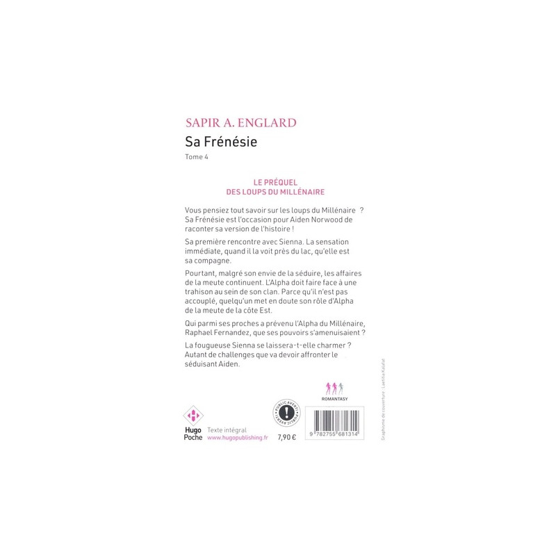 Vous pensiez tout savoir sur les loups du Millénaire ? Sa Frénésie est l'occasion pour Aiden Norwood de raconter sa version de l'histoire ! Sa première rencontre avec Sienna. La sensation immédiate, quand il la voit près du lac, qu'elle est sa compagne. Pourtant, malgré son envie de la séduire, les affaires de la meute continuent. L'Alpha doit faire face à une … Vous pensiez tout savoir sur les loups du Millénaire ? Sa Frénésie est l'occasion pour Aiden Norwood de raconter sa version de l'histoire ! Sa première rencontre avec Sienna. La sensation immédiate, quand il la voit près du lac, qu'elle est sa compagne. Pourtant, malgré son envie de la séduire, les affaires de la meute continuent. L'Alpha doit faire face à une trahison au sein de son clan. Parce qu'il n'est pas accouplé, quelqu'un met en doute son rôle d'Alpha de la meute de la côte Est. Qui parmi ses proches a prévenu l'Alpha du Millénaire, Raphael Fernandez, que ses pouvoirs s'amenuisaient ? La fougueuse Sienna se laissera-t-elle charmer ? Autant de challenges que va devoir affronter te séduisant Aiden.