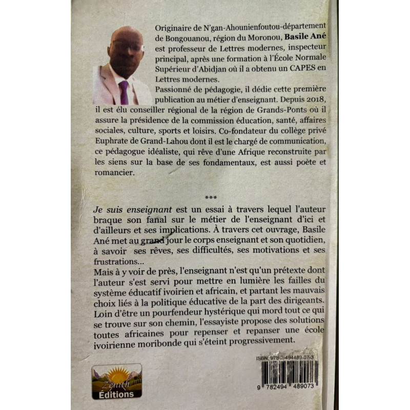 Je suis enseignant est un essai à travers lequel l'auteur braque son fanal sur le métier de l'enseignant d'ici et d'ailleurs et ses implications. À travers cet ouvrage, Basile Ané met au grand jour le corps enseignant et son quotidien, à savoir ses rêves, ses difficultés, ses motivations et ses frustrations... Mais à y voir de près, l'enseignant n'est qu'un prétexte dont lauteur sest servi pour mettre en lumière les failles du système éducatif ivoirien et africain, et partant les mauvais choix liés à la politique éducative de la part des dirigeants. Loin d'être un pourfendeur hystérique qui mord tout ce qui se trouve sur son chemin, l'essayiste propose des solutions toutes africaines pour repenser et repanser une école ivoirienne moribonde qui s'éteint progressivement.