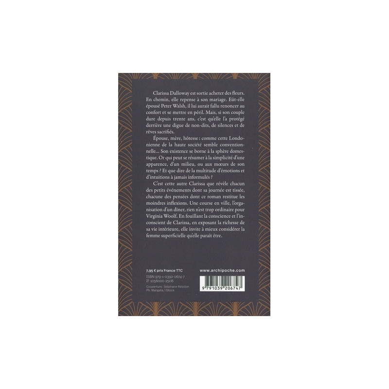 Une page du roman britannique se tourne avec Mrs Dalloway, au rythme des heures égrenées par l'horloge de Big Ben. Clarissa Dalloway est sortie acheter des fleurs. En chemin, elle repense à son mariage. Eût-elle épousé Peter Walsh, il lui aurait fallu renoncer au confort et se mettre en péril. Mais, si son couple dure depuis trente ans, c'est qu'elle l'a protégé … Une page du roman britannique se tourne avec Mrs Dalloway, au rythme des heures égrenées par l'horloge de Big Ben. Clarissa Dalloway est sortie acheter des fleurs. En chemin, elle repense à son mariage. Eût-elle épousé Peter Walsh, il lui aurait fallu renoncer au confort et se mettre en péril. Mais, si son couple dure depuis trente ans, c'est qu'elle l'a protégé derrière une digue de non-dits, de silences et de rêves sacrifiés. Epouse, mère, hôtesse : comme cette Londonienne de la haute société semble conventionnelle... Son existence se borne à la sphère domestique. Or qui peut se résumer à la simplicité d'une apparence, d'un milieu, ou aux moeurs de son temps ? Et que dire de la multitude d'émotions et d'intuitions à jamais informulés ? C'est cette autre Clarissa que révèle chacun des petits événements dont sa journée est tissée, chacune des pensées dont ce roman restitue les moindres inflexions. Une course en ville, l'organisation d'un dîner, rien n'est trop ordinaire pour Virginia Woolf. En fouillant la conscience et l'inconscient de Clarissa, en exposant la richesse de sa vie intérieure, elle invite à mieux considérer la femme superficielle qu'elle paraît être.