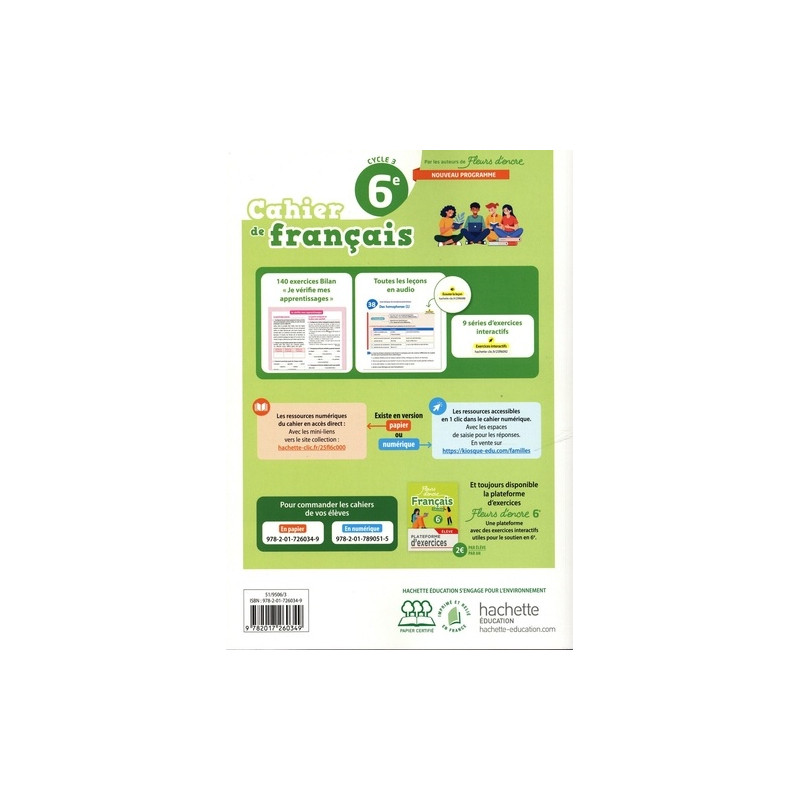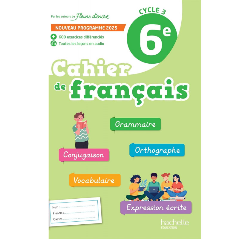 Vous retrouverez dans votre cahier de français Fleurs d'encre 6eédition 2025 : - Un cahier utilisable en complément de tout manuel au collège, pour travailler la langue et l'expression écrite. - Une progression conforme aux repères annuels et en cohérence avec le niveau en sixième. - Des leçons courtes et visuelles, pour faciliter l'apprentissage, sur les compétences fondamentales du français, proposées également en version audio, pour les élèves à besoin spécifiques. - Un vaste choix d'exercice avec des indications de niveaux, pour permettre la différenciation en classe. - Des exercices d'autoévaluation, interactifs et autocorrectifs, pour s'entraîner en autonomie. - Des dictées préparées et enregistrées pour développer les compétences en orthographe. - En tout 600 exercices progressifs dont 120 exercices Bilan, en grammaire, orthographe, conjugaison, vocabulaire et expression écrite.