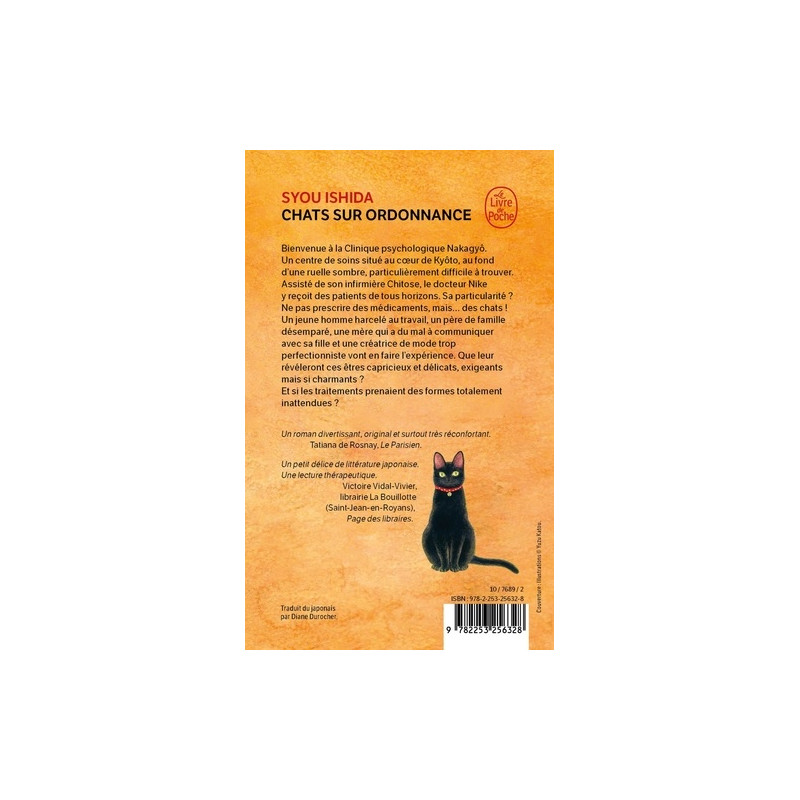 Bienvenue à la Clinique psychologique Nakagyô. Un centre de soins situé au cœur de Kyôto, au fond d'une ruelle sombre, particulièrement difficile à trouver. Assisté de son infirmière Chitose, le docteur Nike y reçoit des patients de tous horizons. Sa particularité ? Ne pas prescrire des médicaments, mais... des chats ! Un jeune homme harcelé au travail, un père d… Bienvenue à la Clinique psychologique Nakagyô. Un centre de soins situé au coeur de Kyôto, au fond d'une ruelle sombre, particulièrement difficile à trouver. Assisté de son infirmière Chitose, le docteur Nike y reçoit des patients de tous horizons. Sa particularité ? Ne pas prescrire des médicaments, mais... des chats ! Un jeune homme harcelé au travail, un père de famille désemparé, une mère qui a du mal à communiquer avec sa fille, une créatrice de mode trop perfectionniste vont en faire l'expérience. Que leur révéleront ces êtres capricieux et délicats, exigeants mais si charmants ? Et si les traitements prenaient des formes totalement inattendues ? Un roman divertissant, original et surtout très réconfortant. Tatiana de Rosnay, Le Parisien. Un petit délice de littérature japonaise. Une lecture thérapeutique. Victoire Vidal-Vivier, librairie La Bouillotte (Saint-Jean-en-Royans), Page des libraires. Traduit du japonais par Diane Durocher