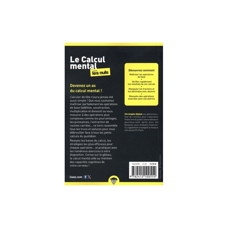 Calculer de tête n'aura jamais été aussi simple ! Que vous souhaitiez maîtriser parfaitement les opérations de base (addition, soustraction, multiplication et division) ou vous mesurer à des opérations plus complexes comme les pourcentages, les puissances, l'extraction de racines carrées... ce livre rassemble tous les trucs et astuces pour vous débrouiller face à tous les petits calculs du quotidien. Revoyez les bases du calcul, les stratégies les plus efficaces pour chaque opération... et pratiquez avec les nombreux exercices à votre disposition. Cerise sur le gâteau, le calcul mental aide au maintien des capacités cognitives de notre cerveau !