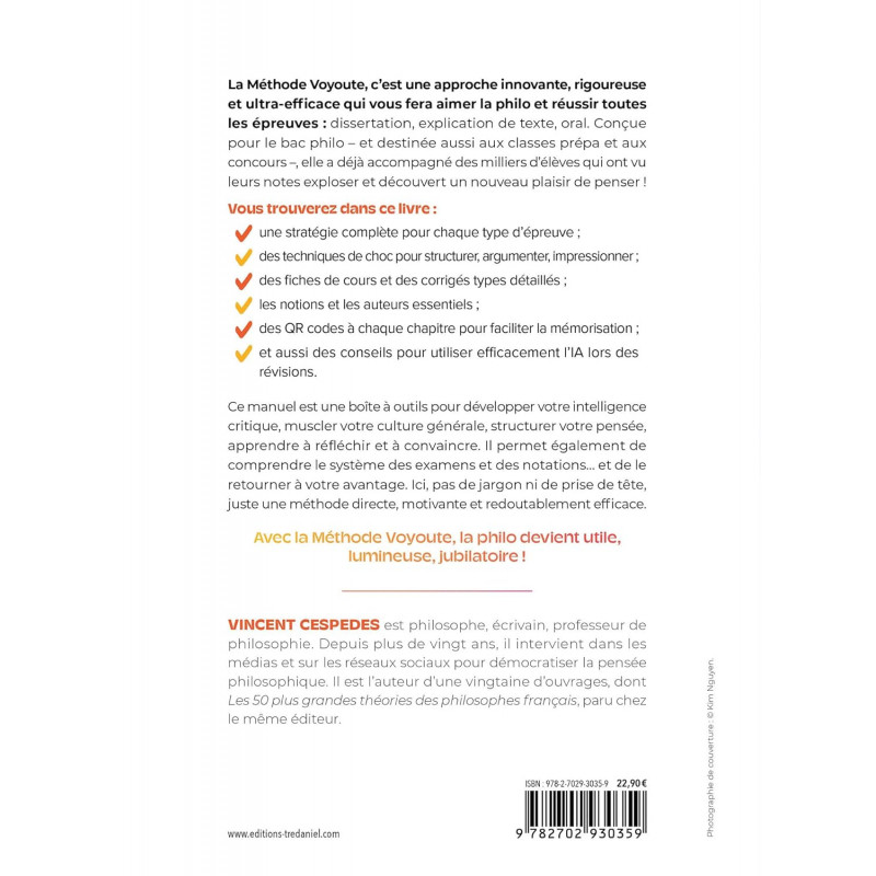 La Méthode Voyoute, c'est une approche innovante, rigoureuse et ultra-efficace qui vous fera aimer la philo et réussir toutes les épreuves : dissertation, explication de texte, oral. Conçue pour le bac philo - et destinée aussi aux classes prépa et aux concours -, elle a déjà accompagné des milliers d'élèves qui ont vu leurs notes exploser et découvert un nouveau plaisir de penser ! Vous trouverez dans ce livre : une stratégie complète pour chaque type d'épreuve ; des techniques de choc pour structurer, argumenter, impressionner ; des fiches de cours et des corrigés types détaillés ; les notions et les auteurs essentiels ; des QR codes à chaque chapitre pour faciliter la mémorisation ; et aussi des conseils pour utiliser efficacement l'IA lors des révisions. Ce manuel est une boîte à outils pour développer votre intelligence critique, muscler votre culture générale, structurer votre pensée, apprendre à réfléchir et à convaincre. Il permet également de comprendre le système des examens et des notations... et de le retourner à votre avantage. Ici, pas de jargon ni de prise de tête, juste une méthode directe, motivante et redoutablement efficace. Avec la Méthode Voyoute, la philo devient utile, lumineuse, jubilatoire !