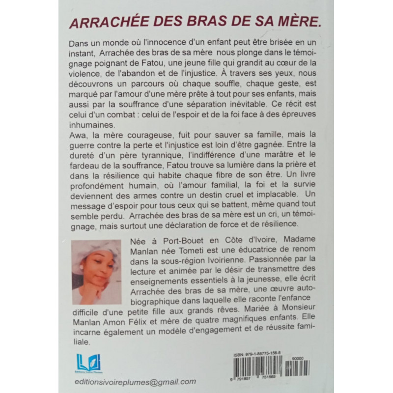 Dans un monde où l'innocence d'un enfant peut être brisée en un instant, Arrachée des bras de sa mère nous plonge dans le témoignage poignant de Fatou, une jeune fille qui grandit au cœur de la violence, de l'abandon et de l'injustice. A travers ses yeux, nous découvrons un parcours où chaque souffle, chaque geste, est marqué par l'amour d'une mère prête à tout pour ses enfants, mais aussi par la souffrance d'une séparation inévitable. Ce récit est celui d'un combat: celui de l'espoir et de la foi face à des épreuves inhumaines. Awa, la mère courageuse, fuit pour sauver sa famille, mais la guerre contre la perte et l'injustice est loin d'être gagnée. Entre la dureté d'un père tyrannique, l'indifférence d'une marâtre et le fardeau de la souffrance, Fatou trouve sa lumière dans la prière et dans la résilience qui habite chaque fibre de son être. Un livre profondément humain, où l'amour familial, la foi et la survie deviennent des armes contre un destin cruel et implacable. Un message d'espoir pour tous ceux qui se battent, même quand tout semble perdu. Arrachée des bras de sa mère est un cri, un témoignage, mais surtout une déclaration de force et de résilience.