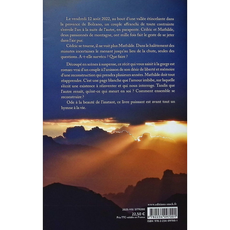 Le vendredi 12 août 2022, au bout d'une vallée étincelante dans la province de Bolzano, un couple affranchi de toute contrainte s'envole l'un à la suite de l'autre, en parapente. Cédric et Mathilde, deux passionnés de montagne, ont mille fois fait le geste de se jeter dans l'air pur. Cédric se tourne, il ne voit plus Mathilde. Dans le halètement des minutes incertaines le menant jusqu'au lieu de la chute, seules des questions. A-t-elle survécu ? Que faire ? Découpé en scènes à suspense, ce récit qui vous saisit à la gorge est roman-vrai d'un couple à l'unisson de son désir de liberté et mémoire d'une reconstruction qui prendra plusieurs années. Mathilde doit tout réapprendre. C'est une page blanche que l'amour imbibe, sur laquelle s'écrit une existence à réinventer et qui nous interroge. Tandis que l'autre renaît, qu'est-ce qui meurt en soi ? Comment ensemble se reconstruire ? Ode à la beauté de l'instant, ce livre puissant est avant tout un hymne à la vie