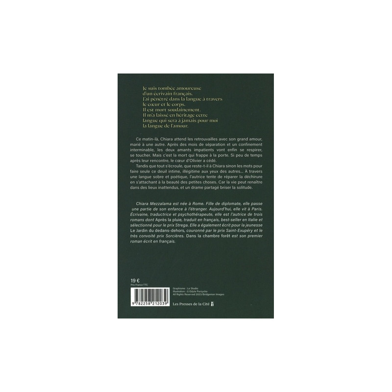 Je suis tombée amoureuse d'un écrivain français. J'ai pénétré dans la langue à travers le coeur et le corps. Il est mort soudainement. Il m'a laissé en héritage cette langue qui sera à jamais pour moi la langue de l'amour. Ce matin-là, Chiara attend les retrouvailles avec son grand amour, marié à une autre. Après des mois de séparation et un confinement interminable, les deux amants impatients vont enfin se respirer, se toucher. Mais c'est la mort qui frappe à la porte. Si peu de temps après leur rencontre, le coeur d'Olivier a cédé. Tandis que tout s'écroule, que reste-t-il à Chiara sinon les mots pour faire seule ce deuil intime, illégitime aux yeux des autres... A travers une langue sobre et poétique, l'autrice tente de réparer la déchirure en s'attachant à la beauté des petites choses. Car la vie peut renaître dans des lieux inattendus, et un drame partagé briser la solitude.