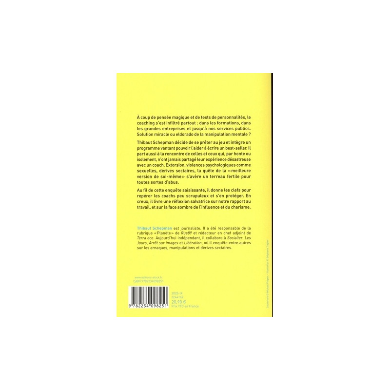 A coup de pensée magique et de tests de personnalités, le coaching s'est infiltré partout : dans les formations, dans les grandes entreprises et jusqu'à nos services publics. Solution miracle ou eldorado de la manipulation mentale ? Thibaut Schepman décide de se prêter au jeu et intègre un programme vantant pouvoir l'aider à écrire un best-seller. Il part aussi à la rencontre de celles et ceux qui, par honte ou isolement, n'ont jamais partagé leur expérience désastreuse avec un coach. Extorsion, violences psychologiques comme sexuelles, dérives sectaires, la quête de la "meilleure version de soi-même" s'avère un terreau fertile pour toutes sortes d'abus. Au fil de cette enquête saisissante, il donne les clefs pour repérer les coachs peu scrupuleux et s'en protéger. En creux, il livre une réflexion salvatrice sur notre rapport au travail, et sur la face sombre de l'influence et du charisme.