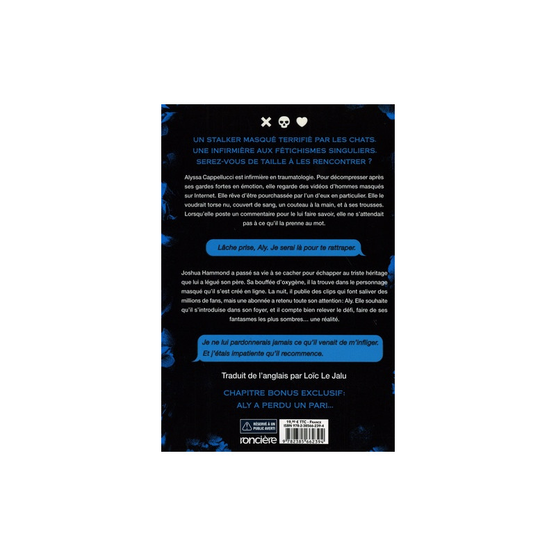 UN STALKER MASQUE TERRIFIE PAR LES CHATS. UNE INFIRMIERE AUX FETICHISMES SINGULIERS. SEREZ-VOUS DE TAILLE A LES RENCONTRER ? Alyssa Cappellucci est infirmière en traumatologie. Pour décompresser après ses gardes fortes en émotion, elle regarde des vidéos d'hommes masqués sur Internet. Elle rêve d'être pourchassée par l'un d'eux en particulier. Elle le voudrait torse nu, couvert de sang, un couteau à la main, et à ses trousses. Lorsqu'elle poste un commentaire pour le lui faire savoir, elle ne s'attendait pas à ce qu'il la prenne au mot. Joshua Hammond a passé sa vie à se cacher pour échapper au triste héritage que lui a légué son père. Sa bouffée d'oxygène, il la trouve dans le personnage masqué qu'il s'est créé en ligne. La nuit, il publie des clips qui font saliver des millions de fans, mais une abonnée a retenu toute son attention : Aly. Elle souhaite qu'il s'introduise dans son foyer, et il compte bien relever le défi, faire de ses fantasmes les plus sombres... une réalité. Traduit de l'anglais par Loïc Le Jalu RESERVE A UN PUBLIC AVERTI