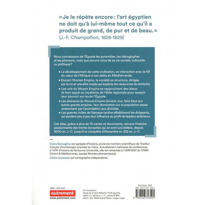 - Les pharaons du Nouvel Empire doivent, eux, faire face aux autres grands empires : leur domination sur la population passe notamment par l'assimilation aux divinités. - Les guerres civiles de l'époque tardive affaiblissent les dirigeants, qui perdent peu à peu leur influence au profit de leaders extérieurs. Cet atlas, grâce à plus de 70 cartes et documents, retrace l'histoire passionnante des trente dynasties qui se sont succédées, depuis 3000 av.