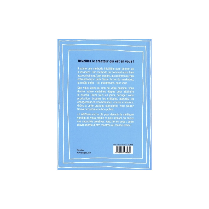Réveillez le créateur qui est en vous ! Il existe une méthode infaillible pour donner vie à vos idées. Une méthode qui convient aussi bien aux écrivains qu'aux leaders, aux peintres qu'aux entrepreneurs. Seth Godin, le roi du marketing, la révèle enfin - ici, maintenant, pour vous. Que vous viviez ou non de votre passion, vous devrez suivre certaines étapes pour atteindre le succès. Créez tous les jours, partagez votre production, écoutez les critiques, apportez du changement et recommencez, encore et encore. Grâce à cette pratique stimulante, vous saurez trouver et séduire le bon public. La Méthode est la clé pour devenir la meilleure version de vous-même et pour utiliser au mieux vos capacités créatives. Ayez foi en vous : votre œuvre mérite d'être montrée au monde entier !
