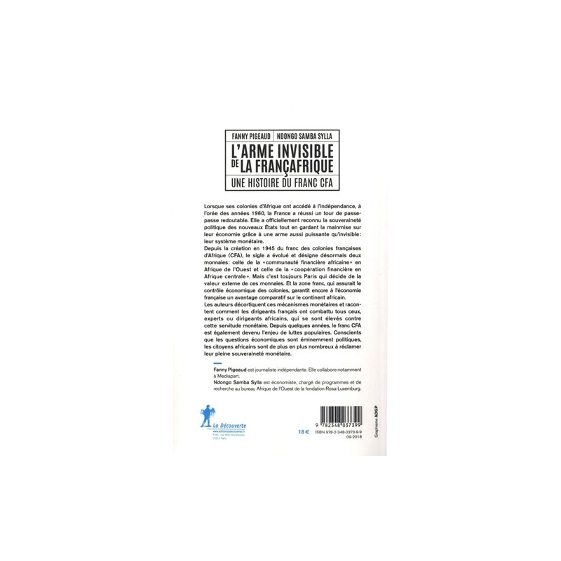 Mais c'est toujours Paris qui décide de la valeur externe de ces monnaies. Et la zone franc, qui assurait le contrôle économique des colonies, garantit encore à l'économie française un avantage comparatif sur le continent africain. Les auteurs décortiquent ces mécanismes monétaires et racontent comment les dirigeants français ont combattu tous ceux, experts ou dirigeants africains, qui se sont élevés contre cette servitude monétaire.