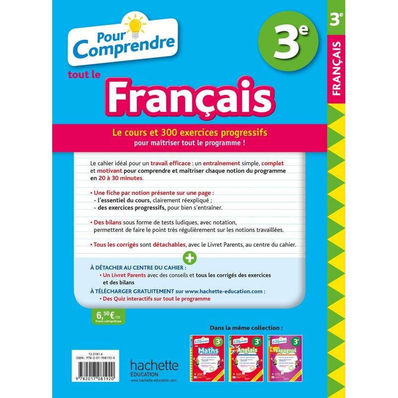 Un Livret Parents avec des conseils et tous les corrigés des exercices et des bilans à détacher au centre du cahier. Des Quiz interactifs sur tout le programme à télécharger gratuitement sur d'hachette-éducation.