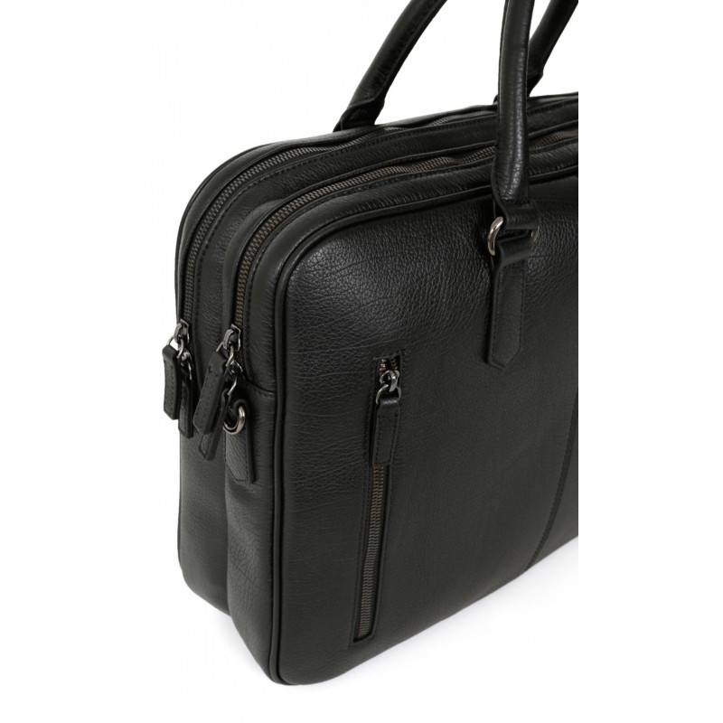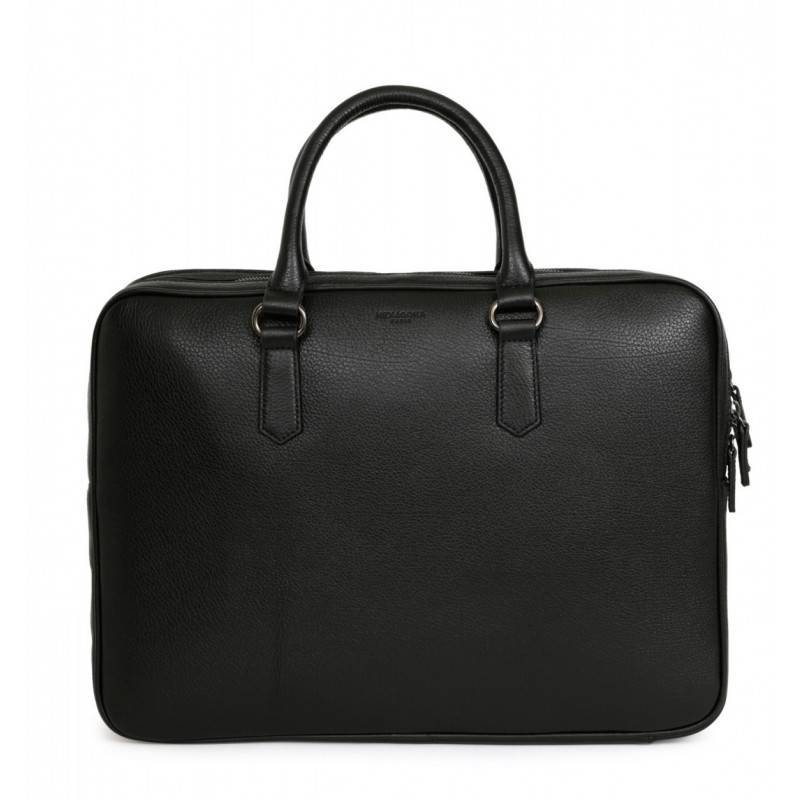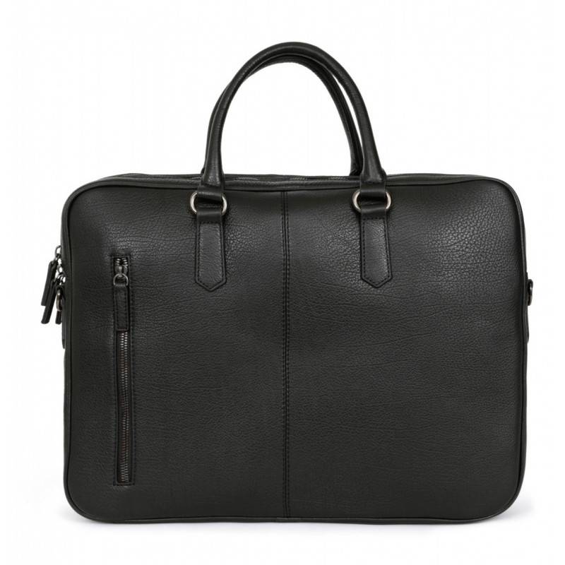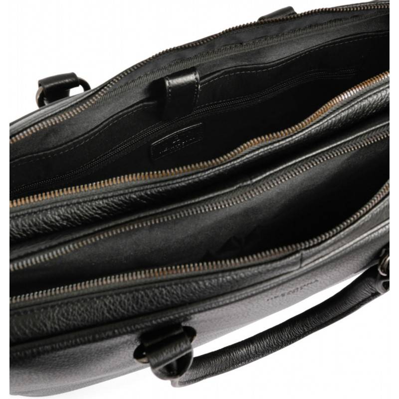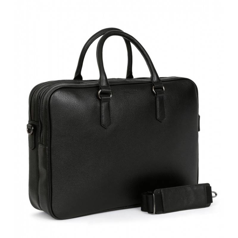 Intérieur : Deux compartiments principaux avec un compartiment ordinateur (dont une poche rembourrée de protection et une poche plate zippée), un compartiment documents avec cinq poches plates et un compartiment téléphone et deux espaces stylo