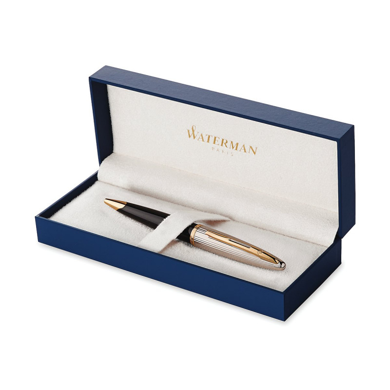 Ce stylo-bille Waterman Carène Deluxe finition or à pointe moyenne est livré dans un élégant écrin, idéal pour un cadeau.
