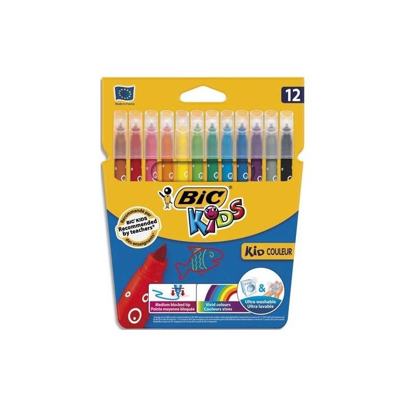 - Ces 12 feutres BIC Kids Kid Couleur se déclinent en 12 tons vifs et lumineux. Ils ont une encre ultra lavable à base d'eau, facile à enlever de la peau et la plupart des tissus. Leur pointe moyenne est bloquée, pour ne pas s'enfoncer à la pression sur le papier. Ils sont adaptés au quotidien des enfants dès 5 ans.