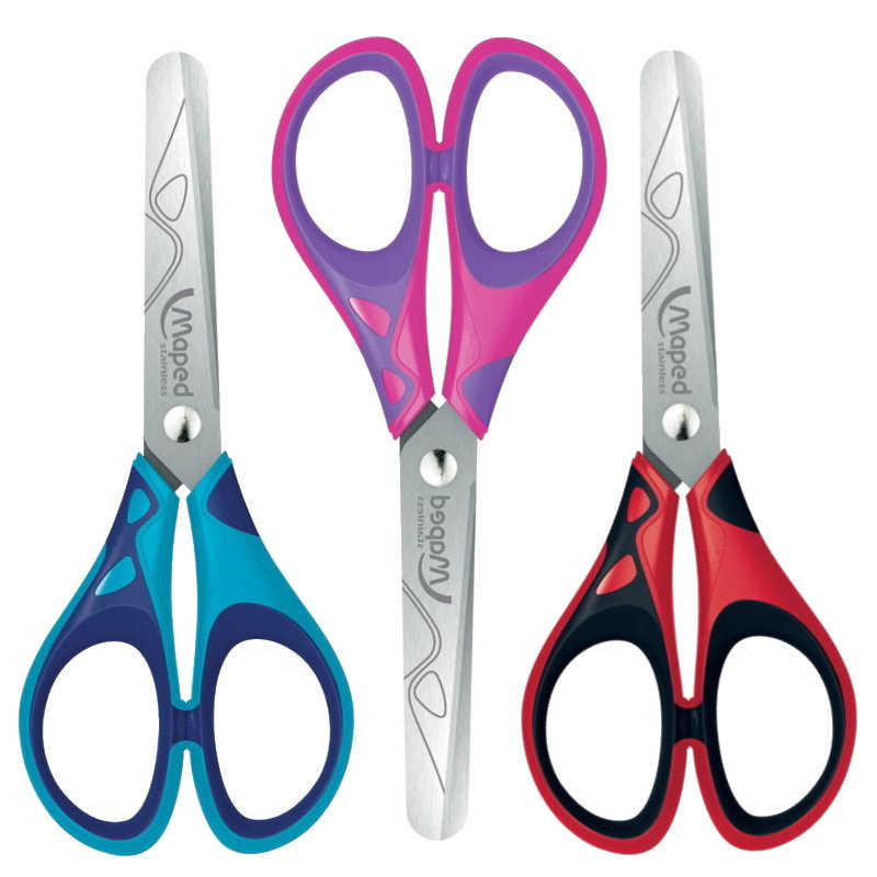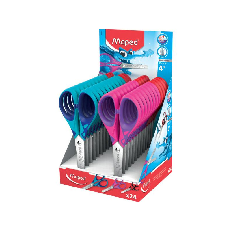 Ciseaux de bricolage Essentials Soft, longueur : 130 mm, affichage cartographié rondes, lames en acier inoxydable, pour gauchers et droitiers, matériau souple à l'intérieur du manche, triées dans les couleurs : bleu, rose et rouge, emballées par 24 pièces (464412).