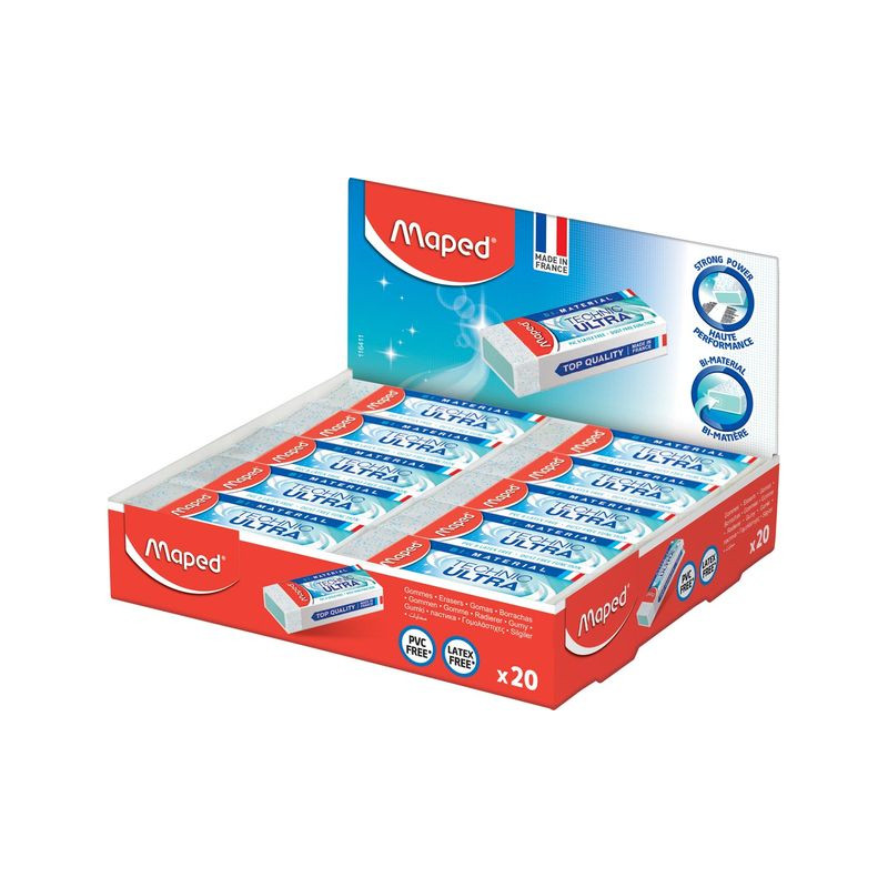 Maped gomme Technic Ultra, présentoir de 20 pièces Nouveau formule pour une force d'effacer améliorée. Matériel double: couche de protection pour maintenir une rectangulaire parfaite. Sans PVC. Moins de résidu après gommage