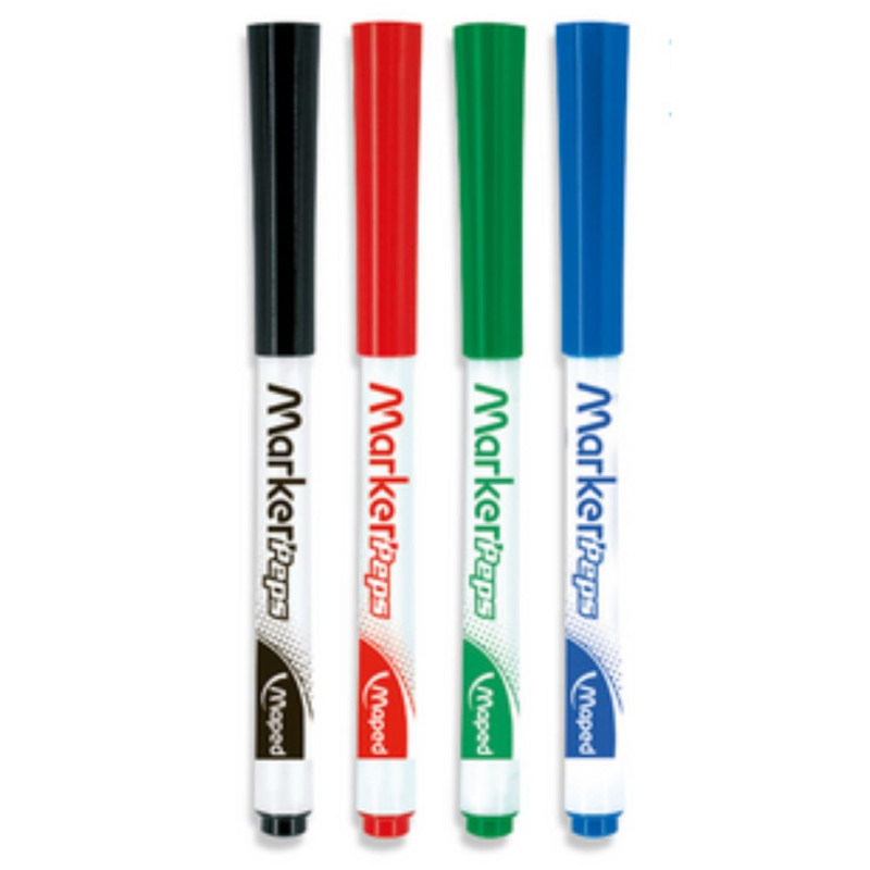 4 Feutres MAPED pour ardoises blanches - coloris assorties. Couleur du pack : rouge, noir, vert, bleu....