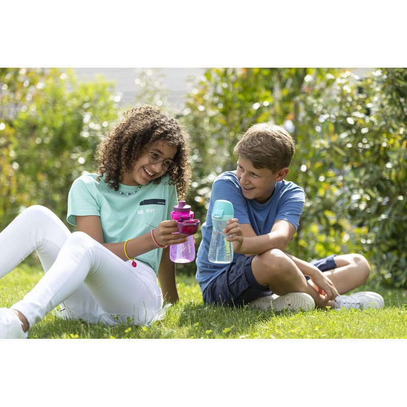 Gourde inspirée par les enfants: elle est facile à ouvrir d'une seule main, il suffit de soulever le capuchon avec son pouce. Etroite en haut, elle est facile à tenir par des petites mains. Parfaitement étanche et antifuite, le goulot au système breveté se referme automatiquement lorsque l'on a fini de boire. Pour boire, il suffit d'appuyer avec sa bouche autour du goulot ou avec un doigt. Le capuchon protège le goulot pour qu'il reste propre. Le corps transparent permet de voir facilement le niveau de liquide. La gourde peut se nettoyer au lave-vaisselle. Le goulot est démontable, pour cela appuyez dessus et faites le tourner dans le sens des aiguilles d'une montre, puis soulevez le. La bouteille d'eau est en plastique garanti sans BPA et sans Phtalates. Tous nos produits sont certifiés contact alimentaire. La bouteille est utilisable avec de l'eau, du sirop ou des jus de fruits, mais pas avec des boissons gazeuses. Pratique à utiliser partout, pour l'école, les sorties scolaires, les activités sportives, mais aussi à la maison pour s'hydrater la nuit sans risque de mettre de l'eau dans son lit. Equiper votre enfant d'une gourde pour l'école c'est favoriser son hydratation tout au long de la journée, ce qui lui permettra de se sentir mieux et d'être plus concentré sur ses leçons. C'est aussi faire un geste pour environnement puisque la gourde est réutilisable au quotidien.