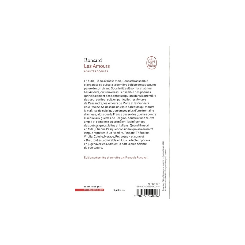 En 1584, un an avant sa mort, Ronsard rassemble et organise ce qui sera la dernière édition de ses œuvres parue de son vivant. Sous le titre désormais habituel Les Amours, on trouvera ici l'ensemble des poèmes (principalement des sonnets) figurant dans la première des sept parties ; soit, en particulier, les Amours de Cassandre, les Amours de Marie et les Sonnets pour Hélène. Se dessine un vaste parcours qui montre la maîtrise de celui qui, en un peu plus d'une trentaine d'années, alors que la France passe des guerres contre l'Empire aux guerres de Religion, construit une œuvre ample et complexe où se mêlent les influences des poètes grecs, latins et italiens. Quand il meurt en 1585, Etienne Pasquier considère qu' "il a en notre langue représenté un Homère, Pindare, Théocrite, Virgile, Catulle, Horace, Pétrarque" et conclut : "Bref, tout est admirable en lui" . Le lecteur pourra en juger avec ces Amours, la part la plus célèbre de son œuvre.