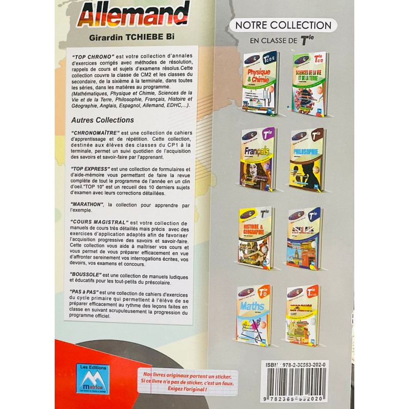 "TOP CHRONO" est votre collection d'annales d'exercices corrigés avec méthodes de résolution, rappels de cours et sujets d'examens résolus. Cette collection couvre la classe de cm2 et les classes du secondaire, de la sixième à la terminale, dans toutes les séries, dans les matières au programme.