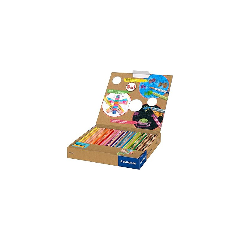 Crayons de couleur gros module hexagonaux pour les premiers coloriages des tout-petits, pouvant faire office de crayon de couleur et de craie à la cire, tout en étant aquarellable. Utilisables aussi bien sur papier,...