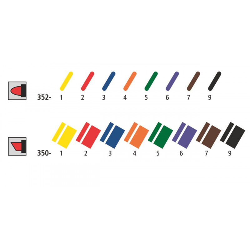 Vendu sous forme de pochette de 6 marqueurs permanents à pointe biseautée avec une pointe de 2,0 à 5,0 mm (rouge, bleu, vert, violet, orange et noir).