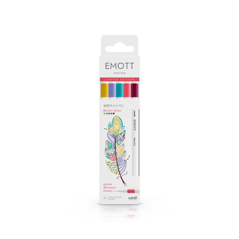 Pochette de 5 uni-EMOTT "Bright boho" feutres d'écriture pointe fine 0.4 mm. Encre à base de pigments et d'eau. Pointe ultra résistante, ne se tord pas, ...