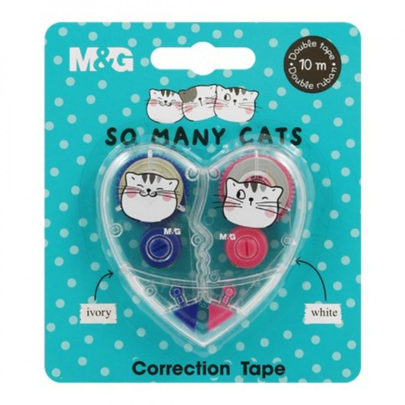 Correcteur ponctuel en forme de cœur - ensemble de 2 pièces. Design Tant de chats ! Le correcteur a une pointe d'application permettant une application facile et propre du film correcteur sec. La bande est disponible en 2 teintes : blanc et ivoire. Largeur de bande de 5 mm, longueur totale de 10 m, livré sur blister.