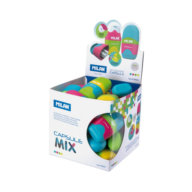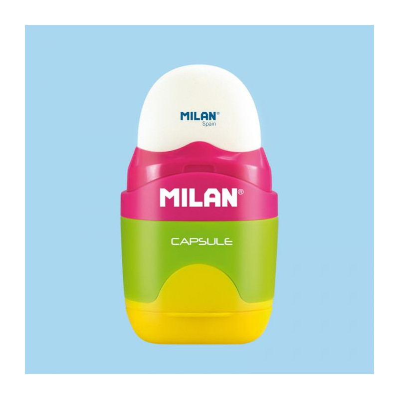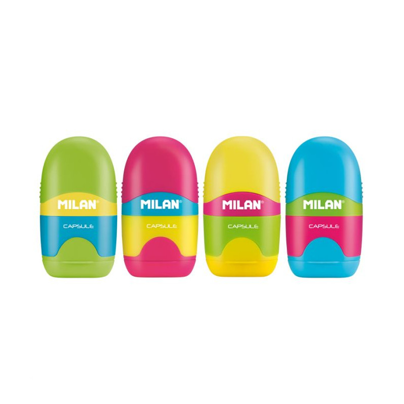 Combinaison de gomme et taille-crayon avec réservoir. Design CAPSULE, série Mix. Gomme en caoutchouc synthétique souple. Le taille-crayon possède une lame en acier tranchante et résistante qui le rend idéal pour toutes les variétés de crayons. Système de lame de sécurité qui empêche la lame de se détacher du corps du taille-crayon. 4 couleurs assorties : rose, vert, jaune et bleu. Design original créé par le département R+D de MILAN.