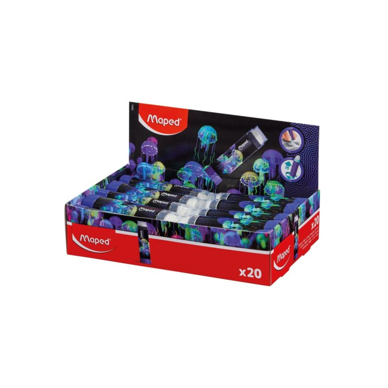 Rien de plus simple et amusant que d'utiliser la gomme retractable Deepsea Paradise MAPED ! Son système rotatif, pour sortir ou rentrer la gomme, ressemble à celui d'un tube de colle. Le gommage est facile et précis, grâce au tube qui tient aisément dans la main. En plus, les mains ne se salissent pas !La gomme Deepsea Paradise ne craint pas les crayons ou les feutres mal rebouchés ! Le tube qui protège la gomme lui permet de rester bien propre dans la trousse. La gomme tube Deepsea Paradise est un bel objet, ultra tendance, grâce à son tube décoré de méduses aux couleurs acidulées. La gomme blanche est fabriquée sans PVC ni phtalate. De quoi gommer pendant toute l'année scolaire !Collection Deepsea Paradise Plonge dans un monde sous-marin hypnotique aux motifs éblouissants. Affirme ton style, écris ton histoire et imagine ton paradis ! Laisse-toi séduire par cette ambiance envoûtante et laisse libre cours à ton imagination dans les profondeur de “Deepsea Paradise”.