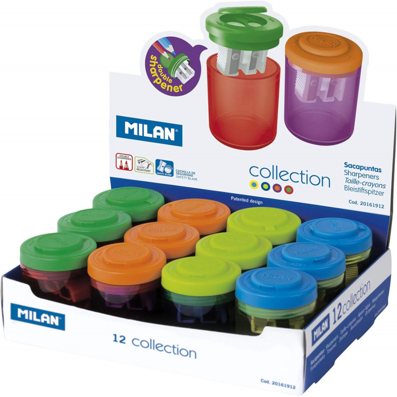 Taille-crayons double (un standard et un MAXI) avec réservoir. Pratique couvercle à vis. Le taille-crayons possède une lame en acier carbone, coupante et résistante, idéale pour tout type de crayons. Article avec une lame de sécurité. Ce système empêche la séparation de la lame et du corps du taille-crayons. Idéal pour un usage scolaire. Conçu en Espagne par le département R+D de Milan. Couleurs assorties disponibles : rouge, lilas, bleu, jaune.