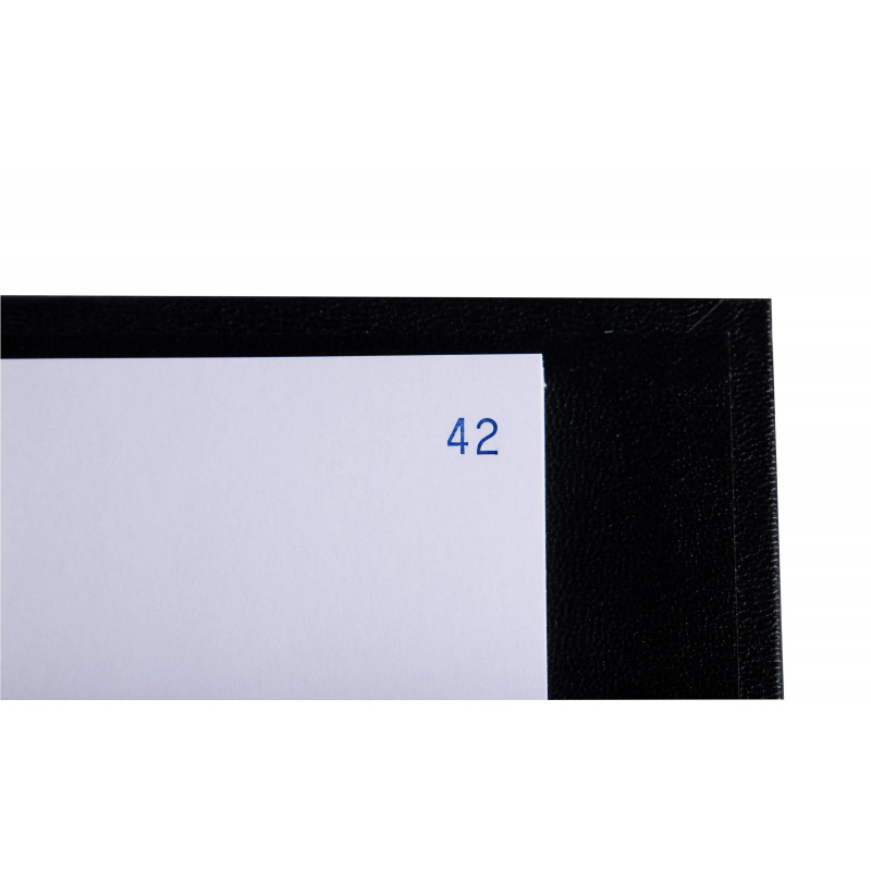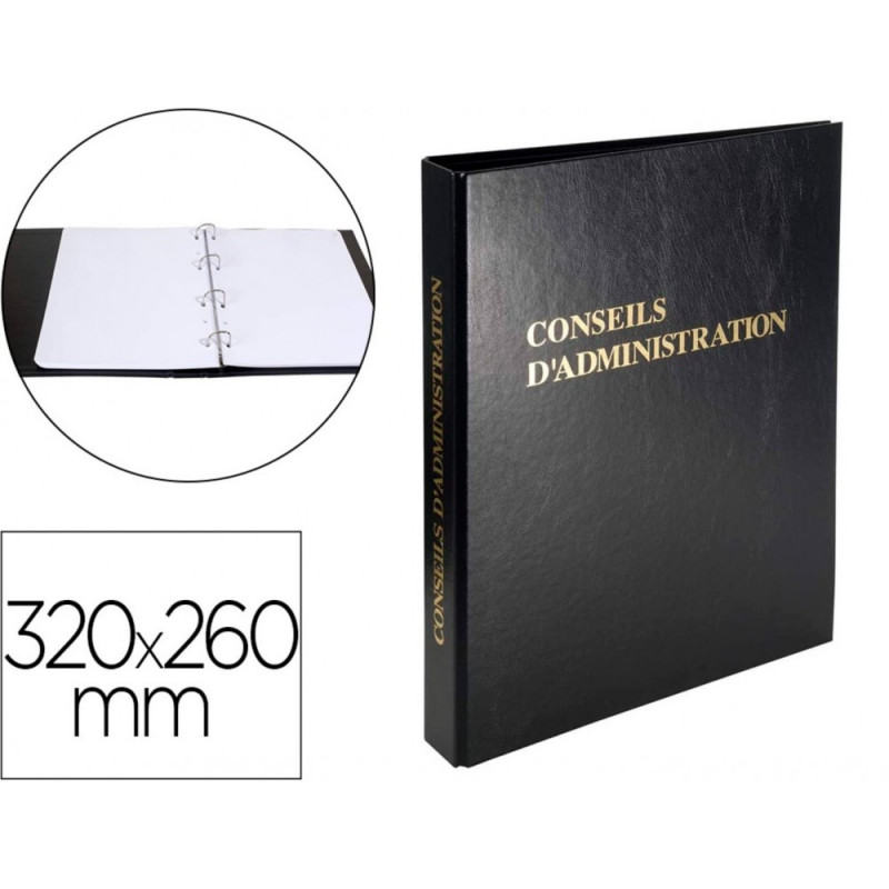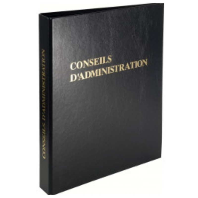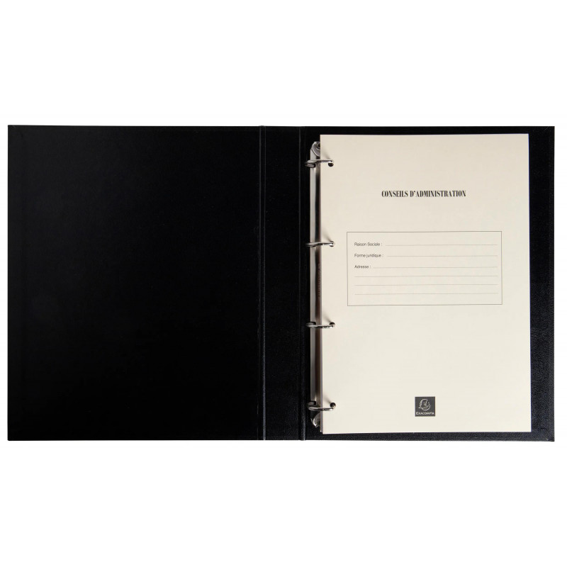 La reliure Exacompta Conseil d'Administration est composée d'un classeur rembordé plastique, 4 anneaux en D en 3ème de couverture (ouverture simultanée des 4 anneaux), avec titre imprimé en doré sur la couverture et au dos du classeur. Elle est équipée d'une recharge de 100 feuilles vierges et foliotées, avec page de garde Conseil d'administration personnalisable.