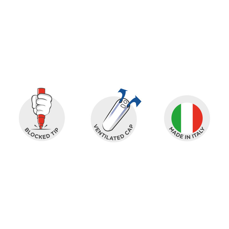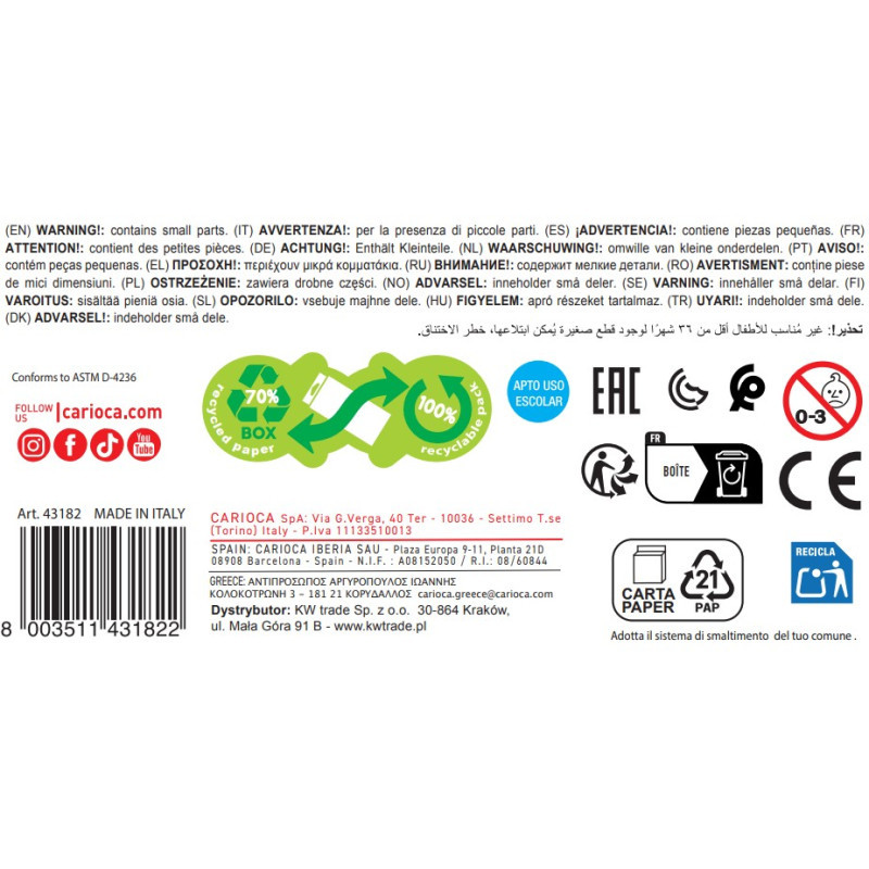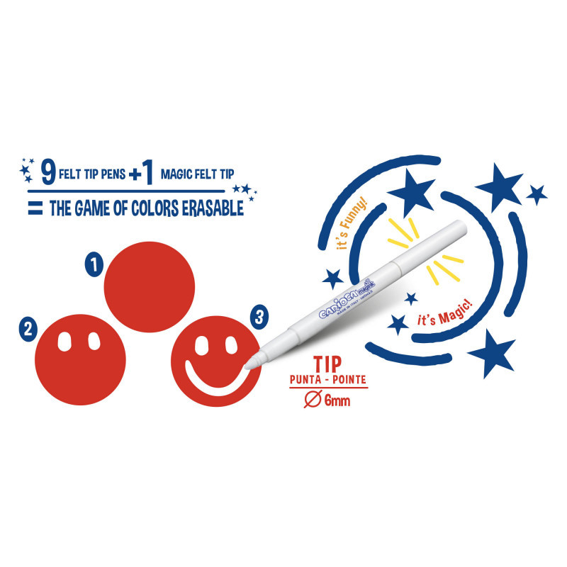 Feutres effaçables de la marque italienne haut de gamme « Carioca ». Un marqueur supplémentaire est inclus pour effacer ou modifier vos créations. L'encre est à base d'eau et de colorant alimentaire, ce qui est sans danger pour la santé et se nettoie facilement des vêtements et des mains. Les capuchons des feutres sont ventilés (ils ne bloquent pas l'accès à l'oxygène en cas d'inhalation). Ils se nettoient facilement des mains et des vêtements.