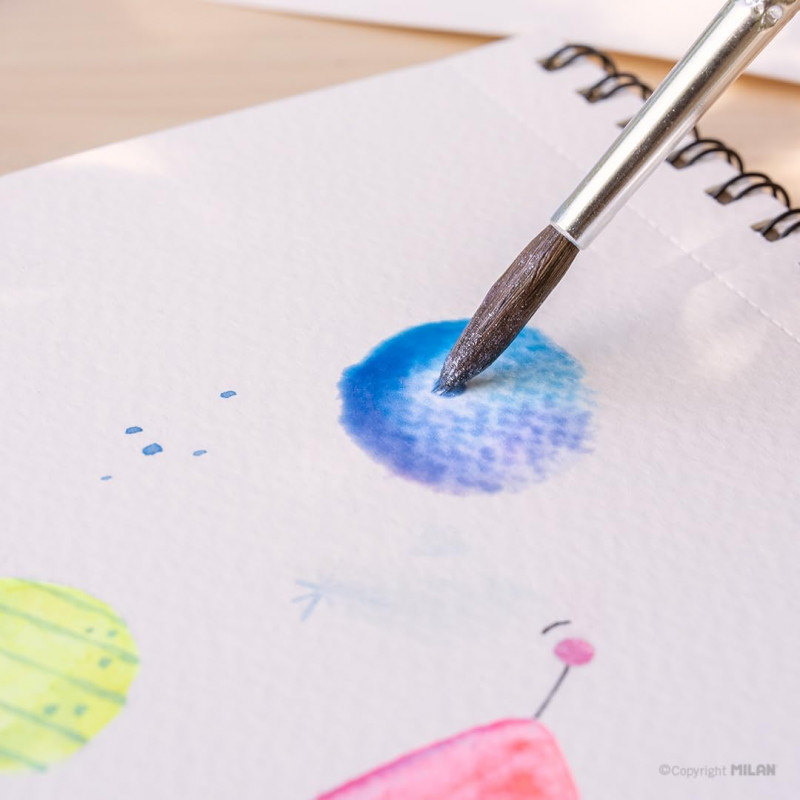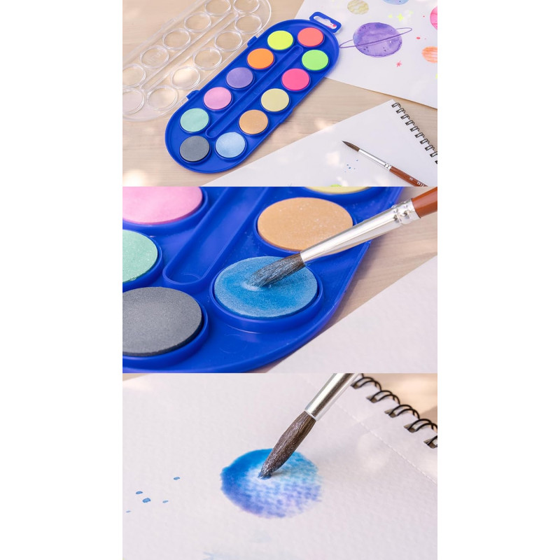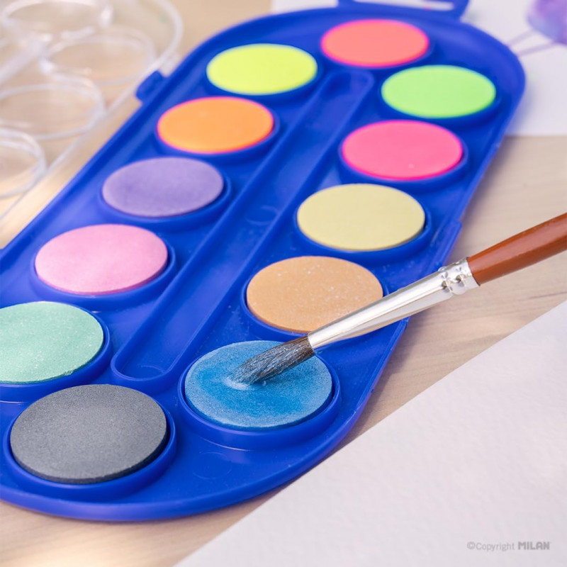 4 pastilles de couleurs fluo et 8 pastilles de couleurs métalisées, de 30 mm Ø. Comprend un pinceau scolaire de la série 101, spécialement indiqué pour l’aquarelle. Les couleurs peuvent se mélanger dans les petits récipients mélangeurs placés au milieude l’étui. Les aquarelles MILAN se présentent sous forme de pastilles rondes et compactes Leurs couleurs sont obtenues à partir de pigments non toxiques et résistants à la lumière. Facilement lavables sur la plupart des textiles.