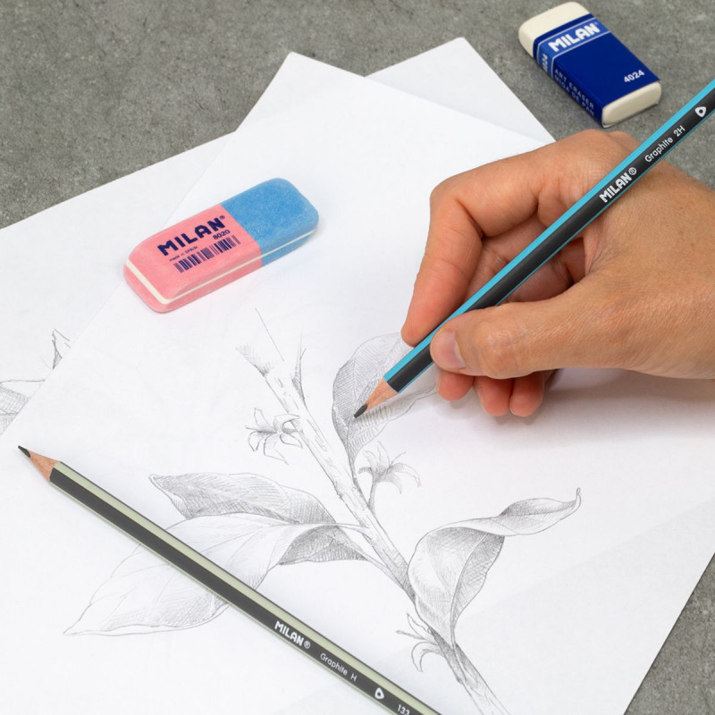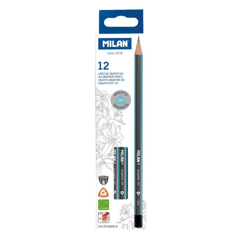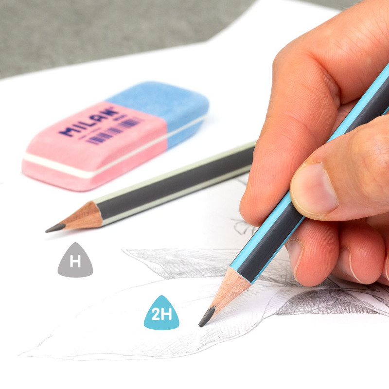 Crayons graphite 2H. Mine de 2 mm Ø. Forme triangulaire ergonomique. Le crayon graphite 2H est dur, ce qui permet des lignes fines et techniques. La mine offre un tracé uniforme et résiste aux cassures grâce au système LPS (Lead Protection System) qui protège la mine en adhérant au bois. Le bois provient de plantations durables.