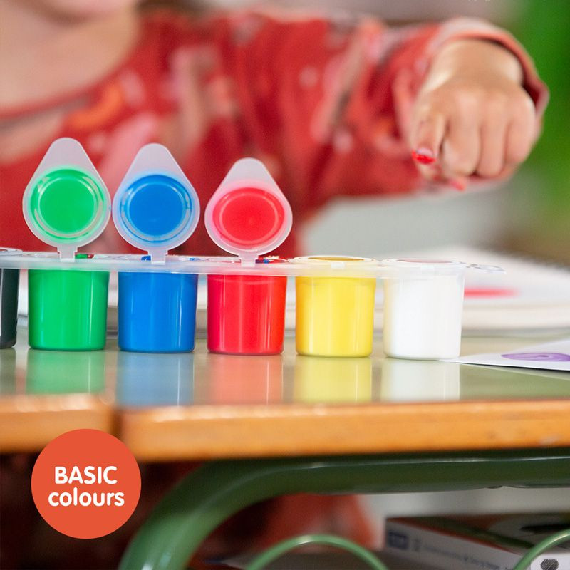 Pots de 25 ml en couleurs assorties : jaune, bleu, blanc, noir, rouge et vert. Peinture au doigt avec une consistance excellente, pour travailler directement avec les mains, idéale pour les travaux manuels enfantins. Le temps de séchage dépend de l’épaisseur de la couche de peinture. Peut s’appliquer facilement avec les doigts, mais aussi avec un carton, un pinceau ou une éponge. Utilisable également pour créer des textures, et imprimer des marques et des tampons. Facilement lavable sur la plupart des tissus. Ses couleurs vives et brillantes peuvent se mélanger afin de créer de nouvelles tonalités.
