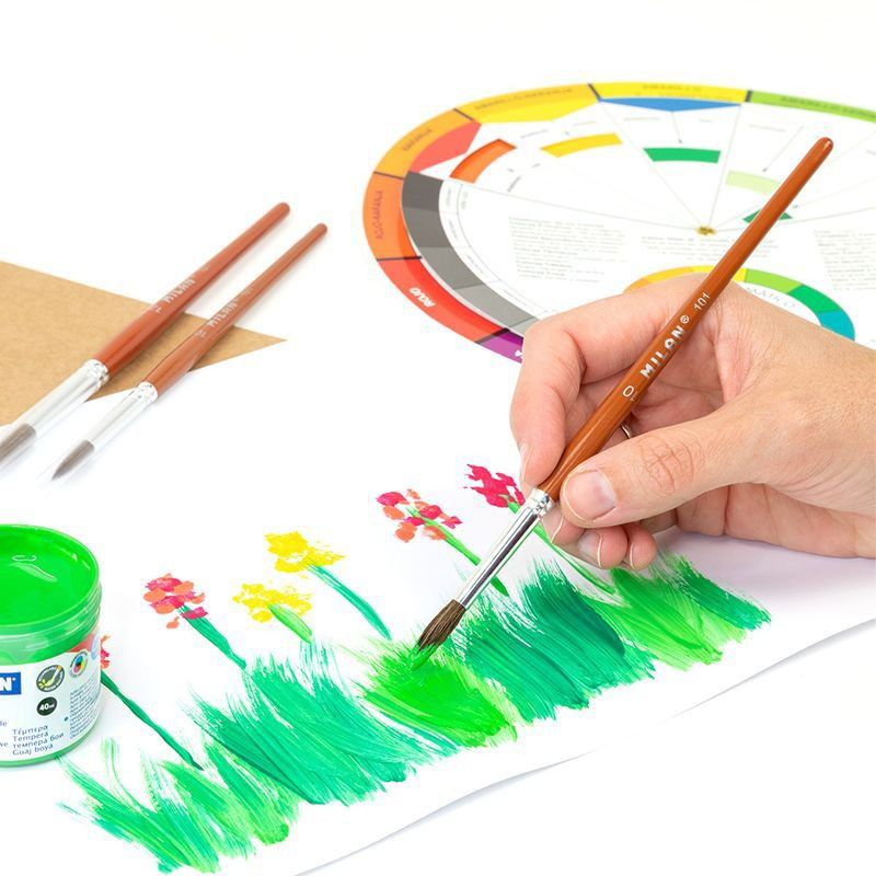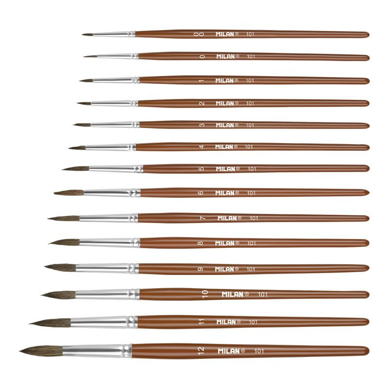 Pinceaux bout rond avec manche court en bois, vernis coloris marron et virole en aluminium. Composition : 70% poils naturels de chèvre + 30% synthétique. Adapté pour l’aquarelle, les techniques à base d’eau ou gouache.