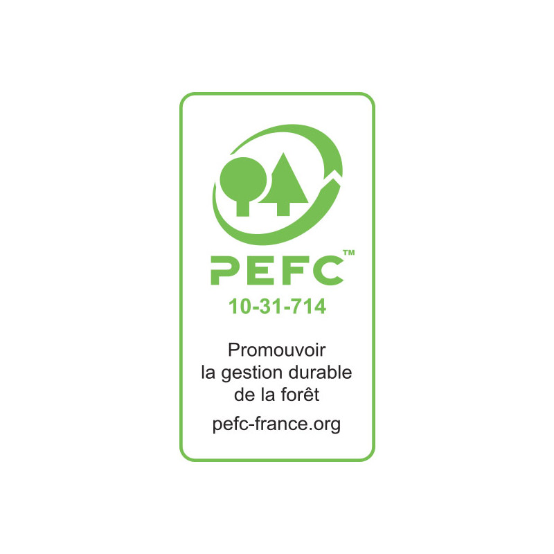 Critères éco-responsables : certifié PEFC (apporte la garantie que ce produit est issu de sources responsables, participant ainsi à la gestion durable des forêts) et fabrication Française (empreinte carbone réduite)