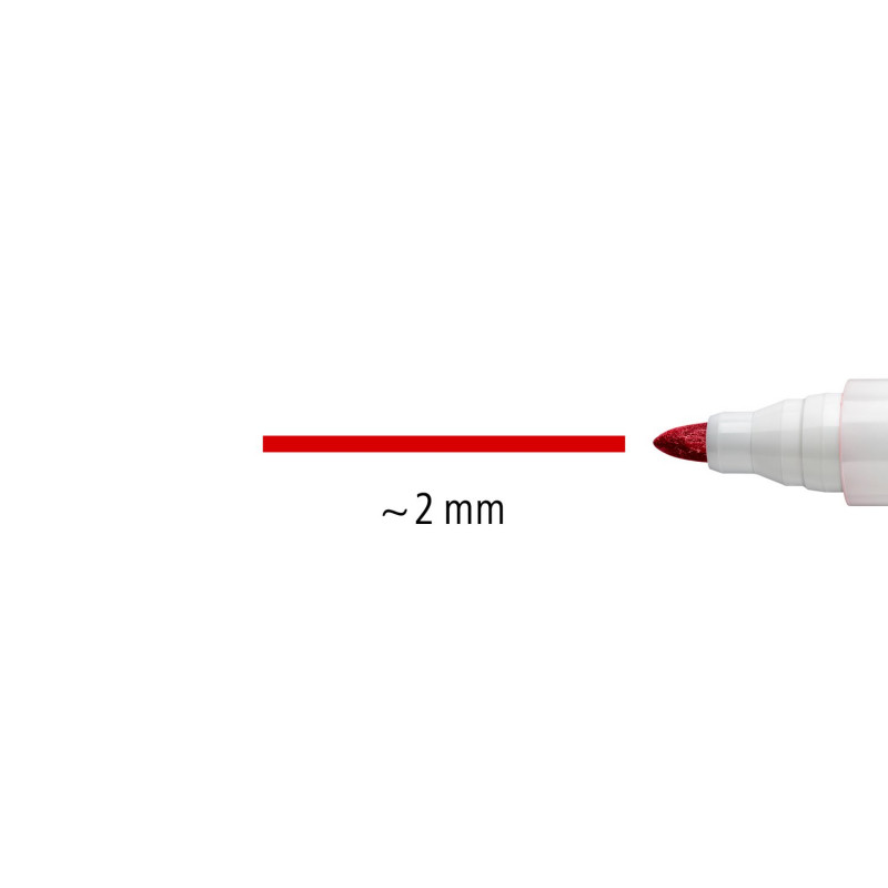 Peut être effacé à sec des tableaux blancs et des surfaces comme le verre et la porcelaine sans laisser de trace Séchage rapide, faible odeur Pointe verrouillée SEC ET SÛR - peut être laissé ouvert pendant des jours sans sécher Le corps et le bouchon en PP garantissent une longue durée de vie Sécurité en avion : l'égalisation automatique de la pression empêche le stylo de fuir à bord de l'avion Largeur de ligne environ 2,0 mm Rechargeable avec station de recharge 488 51 Disponible en boîte STAEDTLER debout Boîtier composé à 97 % de plastique recyclé