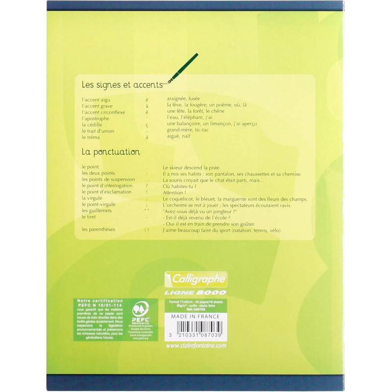 COUVERTURE : carte couchée recyclée pelliculée lavable pour une plus longue durée de vie du cahier GRANDS CARREAUX SPECIAUX : une réglure NON STANDARD avec des grands carreaux AGRANDIS 3mm - Facilite l'APPRENTISSAGE DE L'ECRITURE 32 PAGES : 1 feuille = 2 pages (le verso et le recto de la feuille) donc cahier de 16 feuilles Parfait pour alléger le cartable des enfants ! FORMAT 17x22 cm : petit format scolaire facilement transportable Attention, NE CORRESPOND PAS aux dimensions A5, 14,8x21 cm ni A4 (21x29,7 cm) PAPIER CLAIREFONTAINE 90g : papier blanc Vélin Surfin de QUALITE SUPERIEURE Page résistante à une écriture trop appuyée et à tous les types de stylos ECORESPONSABLE : certifié PEFC pour une gestion durable et respectueuse des forêts Fabriqué en FRANCE