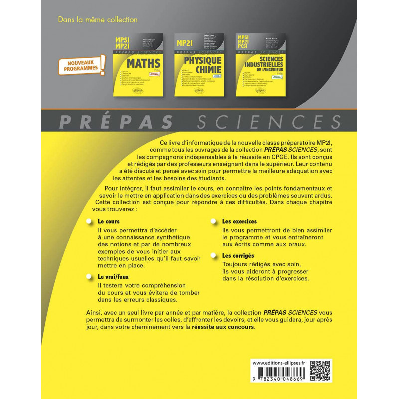 Ce livre d'informatique de la nouvelle classe préparatoire MP2I, comme tous les ouvrages de la collection Prépas sciences, sont les compagnons indispensables à la réussite en CPGE. Ils sont conçus et rédigés par des professeurs enseignant dans le supérieur. Leur contenu a été discuté et pensé avec soin pour permettre la meilleure adéquation avec les attentes et les besoins des étudiants. Pour intégrer, il faut assimiler le cours, en connaître les points fondamentaux et savoir le mettre en application dans des exercices ou des problèmes souvent ardus.