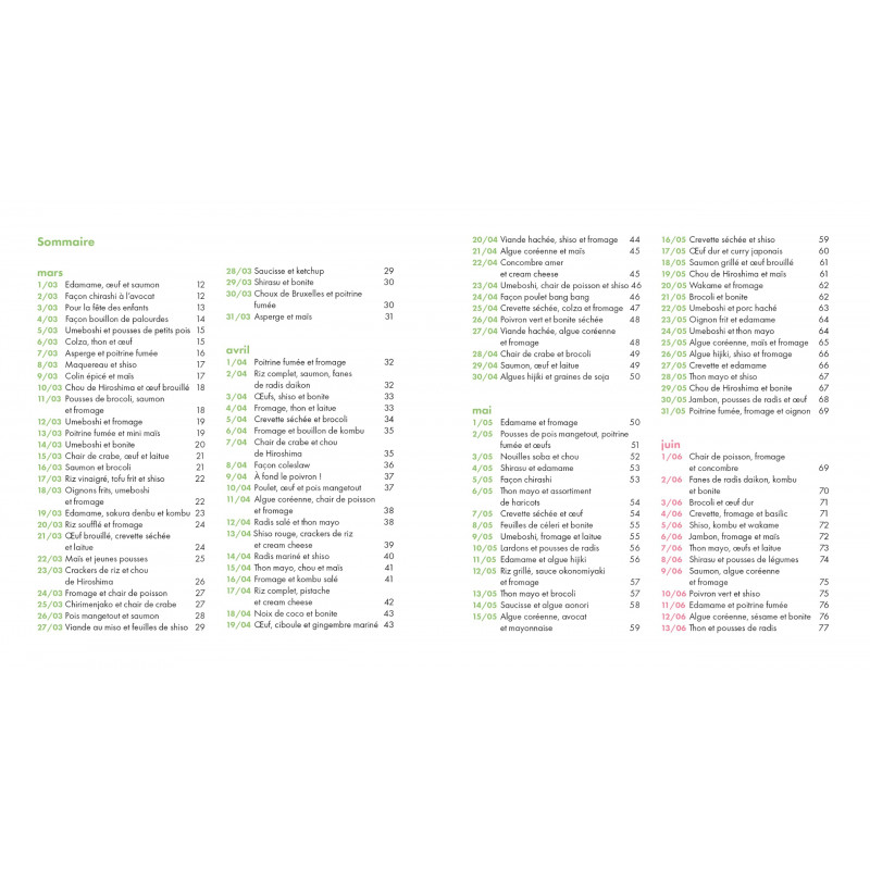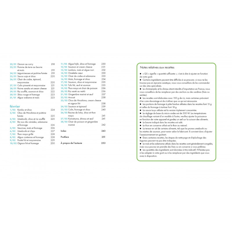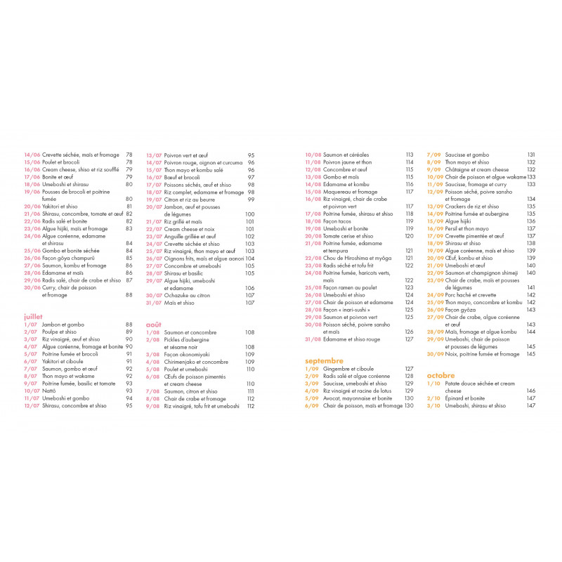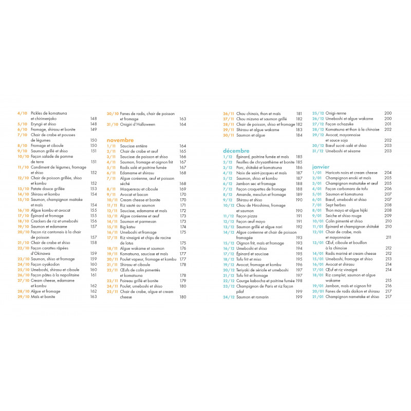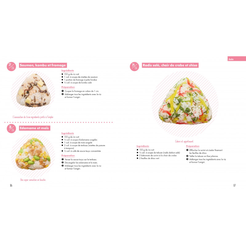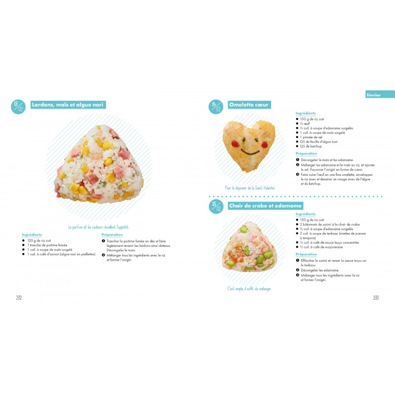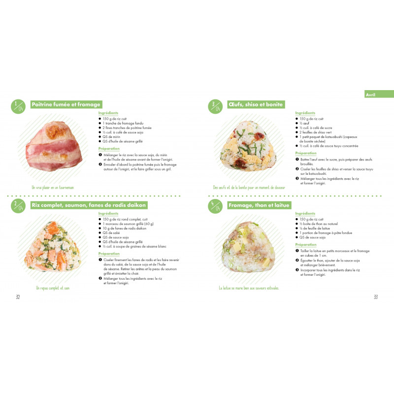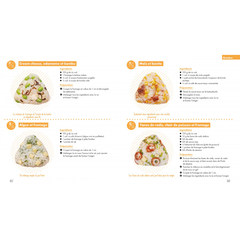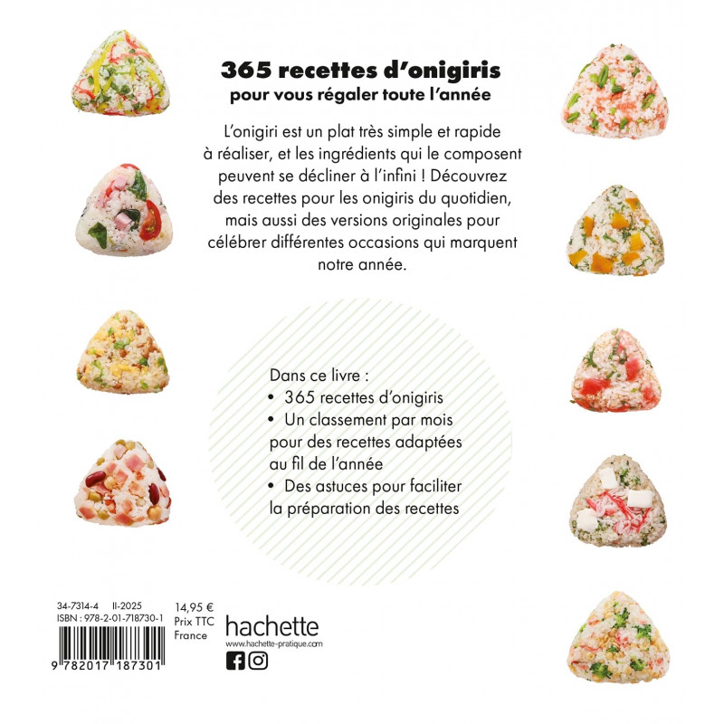 365 recettes d'onigiris pour vous régaler toute l'année L'onigiri est un plat très simple et rapide à réaliser, et les ingrédients qui le composent peuvent se décliner à l'infini ! Découvrez des recettes pour les onigiris du quotidien, mais aussi des versions originales pour célébrer différentes occasions qui marquent notre année. Dans ce livre : - 365 recettes d'onigiri - Un classement par mois pour des recettes adaptées tout au long de l'année - Des astuces pour faciliter la préparation des recettes
