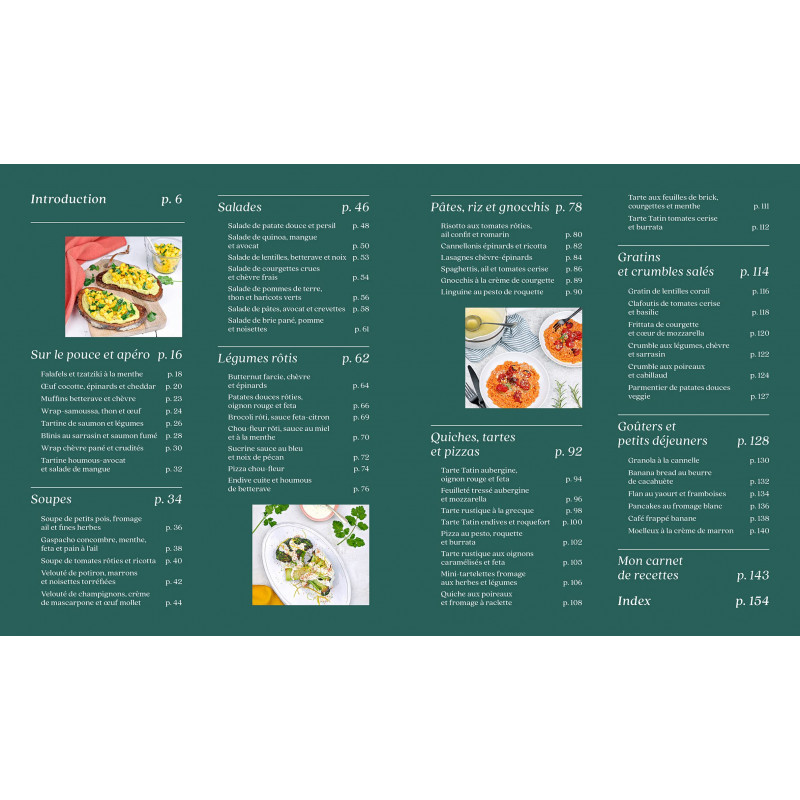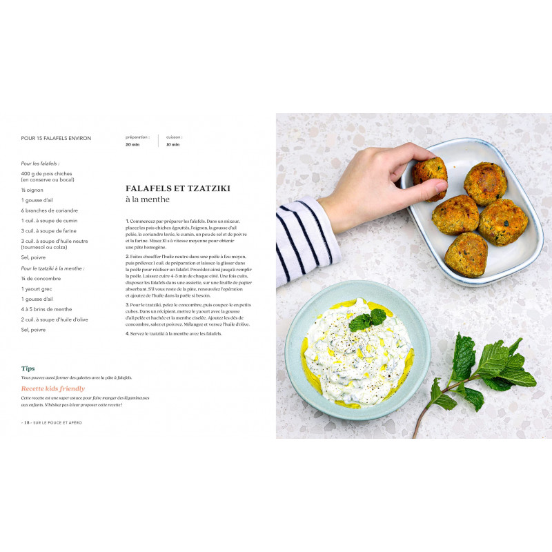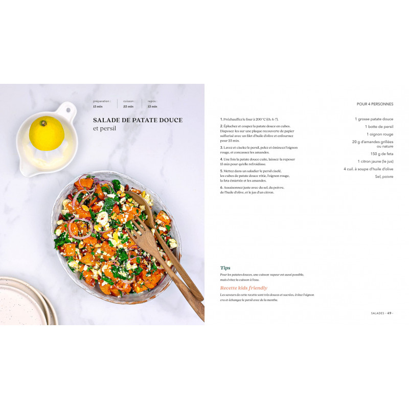 Falafel et tzatziki à la menthe, wrap chèvre pané et crudités, soupe de tomates rôties et ricotta, pizza chou-fleur, feuilleté tressé aubergines et mozza, parmentier de patate douce, granola à la cannelle, moelleux à la crème de marrons... Vous trouverez plus de 50 recettes pour tous les moments de la journée et toutes les occasions pour mettre en place et conserver des habitudes saines. Il n'y a qu'une seule chose à faire pour bien manger : écouter sa faim et son corps et respecter son rythme.