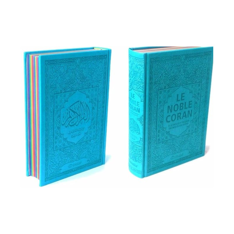 Dans ce magnifique Coran chaque partie (Jouz') est colorée avec une couleur différente, avec un dégradé de couleurs sous forme d'arc-en-ciel. Ce qui aide l'apprentissage et la révision du Saint Coran. Le Saint Coran contient 114 sourates (chapitres), il est découpé en 30 parties appelées jouz' (Chaque partie ou jouz' contient deux hizb, ce qui fait au total 60 hizb). On peut ainsi s'organiser par exemple pour lire chaque jour une partie (une couleur) et finir ainsi la lecture du Coran en un mois. On peut également ouvrir le Coran directement à la partie qu'on est entrain d'apprendre ou de réviser grâce à ce système de couleurs très pratique. Ce Coran Arc-en-ciel (en anglais "Rainbow Quran") a une couverture cartonnée de type daim, doux au toucher. Très jolie couleur bleue claire. Idéal pour offrir. Cette édition a la particularité d'avoir les numéros des versets et des pages de la partie arabe et française en chiffre arabes et non pas en chiffres indiens. Ceci facilitera la lecture et le suivi pour le public francophone. La mise en page a été soignée avec l'utilisation de grands caractères arabes et français pour une lecture agréable. Les règles de lecture (prononciation des lettres ou makhârij al hourouf) sont également détaillés en annexe du livre. Le Coran est cellophané. D'autres couleurs sont disponibles...