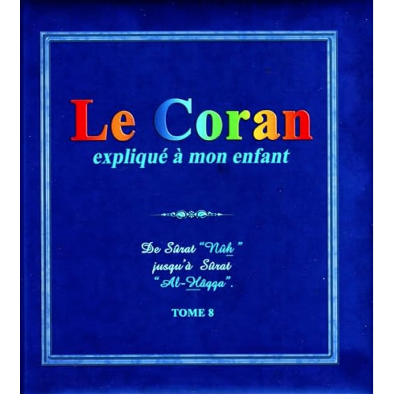 Ce livre apporte les réponses que vos enfants se posent sur le Coran et l'Islam. Ce tome contient Sûrat Nûh, Surât Al-Ma'ârij,Sûrat Al-Hâqqa". Pour chacune d'elle, il y 'a : Le texte arabe (avec le code couleur des règles de Tajwid) et le texte français, l'explication des versets , des rubriques complémentaires (Infos science, des Questionnements", "Mini-Dico", etc.), un glos