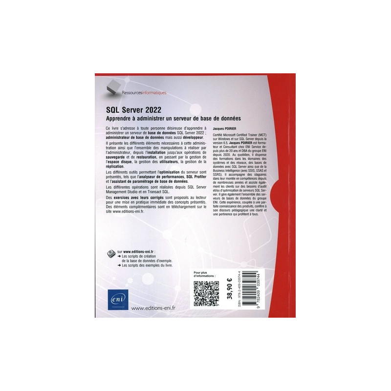Ce livre s'adresse à toute personne désireuse d'apprendre à administrer un serveur de base de données SQL Server 2022 ; administrateur de base de données mais aussi développeur. Il présente les différents éléments nécessaires à cette administration ainsi que l'ensemble des manipulations à réaliser par l'administrateur, depuis l'installation jusqu'aux opérations de sauvegarde et de restauration, en passant par la gestion de l'espace disque, la gestion des utilisateurs, la gestion de la réplication.